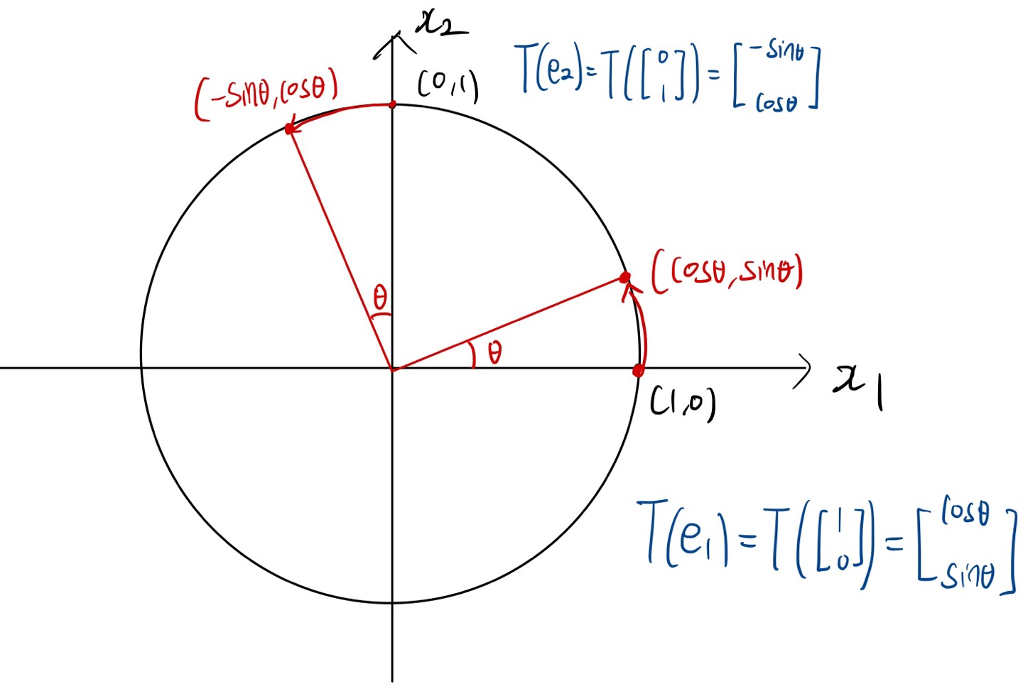 \end{bmatrix}\) 이라는 벡터를 반시계 방향으로 \(\theta\)만큼 회전시키는 transformation이 되므로 \(\mathit{T}(\mathbf{e_1}) = \begin{bmatrix}