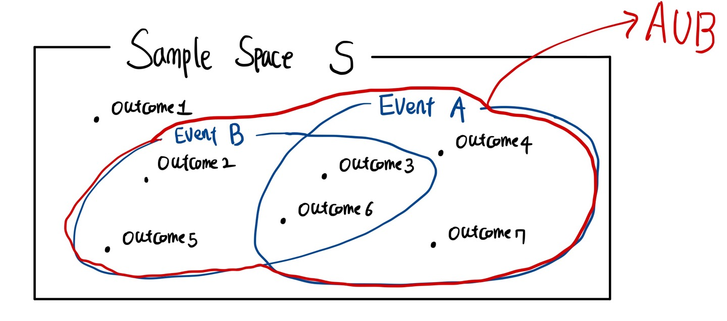 어떤 두 Events \(A\), \(B\)의 Union을 \(A \cup B\)라고 하며, \(A \cup B\)는 \(A\), \(B\) 중 적어도 하나에 속하는 outcomes로 구성된 Event 입니다.