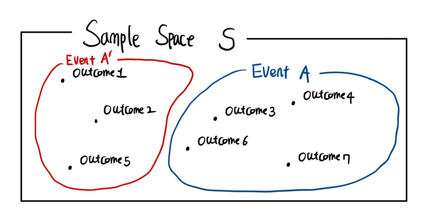 어떤 Event \(A\)의 Complement를 \(A^\prime\)라고 하며, \(A^\prime\)은 Sample Space에 속하면서 동시에 \(A\)에 속하지 않는 모든 outcomes로 구성된 Event를 의미합니다.