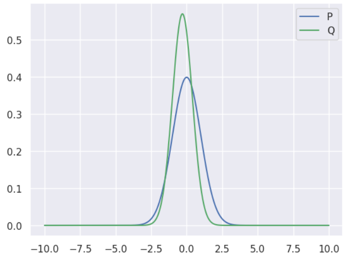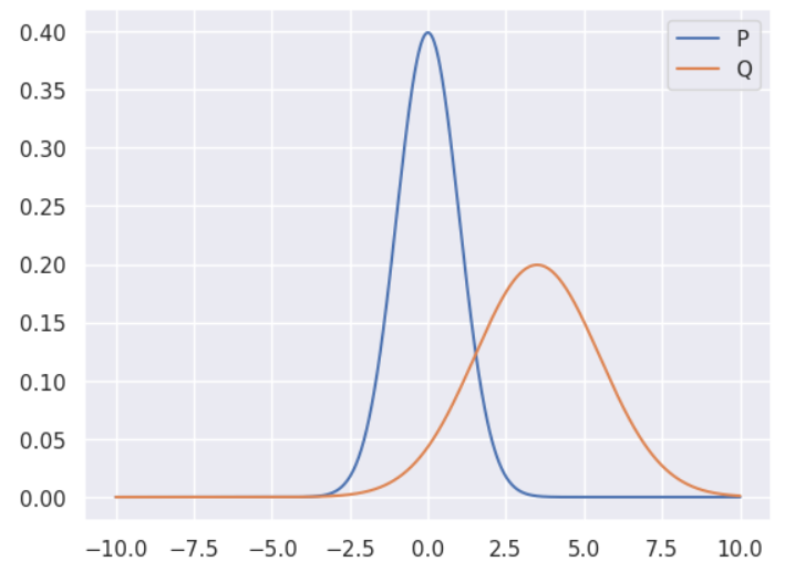 이를 바탕으로 위의 그래프에서 $H(P, Q)$ 와 $H(Q, P)$ 의 값을 비교하면 어떻게 될까요? 당연히 $H(Q, P)$ 가 더 큰 값을 가질 겁니다. $P$ 의 가중치가 큰 부분에서 $Q$ 의 값은 그리 작지 않지만, $Q$ 의 가중치가 큰 부분에서 $P$ 의 값은 매우 작기 때문입니다.
