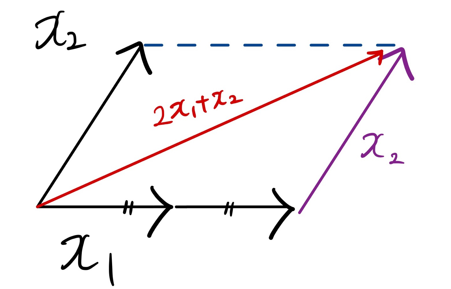 \(\mathbb{R}^2\) space에서 \(x_1, x_2\)라는 특정한 벡터가 있다고 하고, 이 둘은 서로의 상수배가 아니라고 합시다 (이를 선형 독립이라고 하고 이는 나중에 다루겠습니다.)